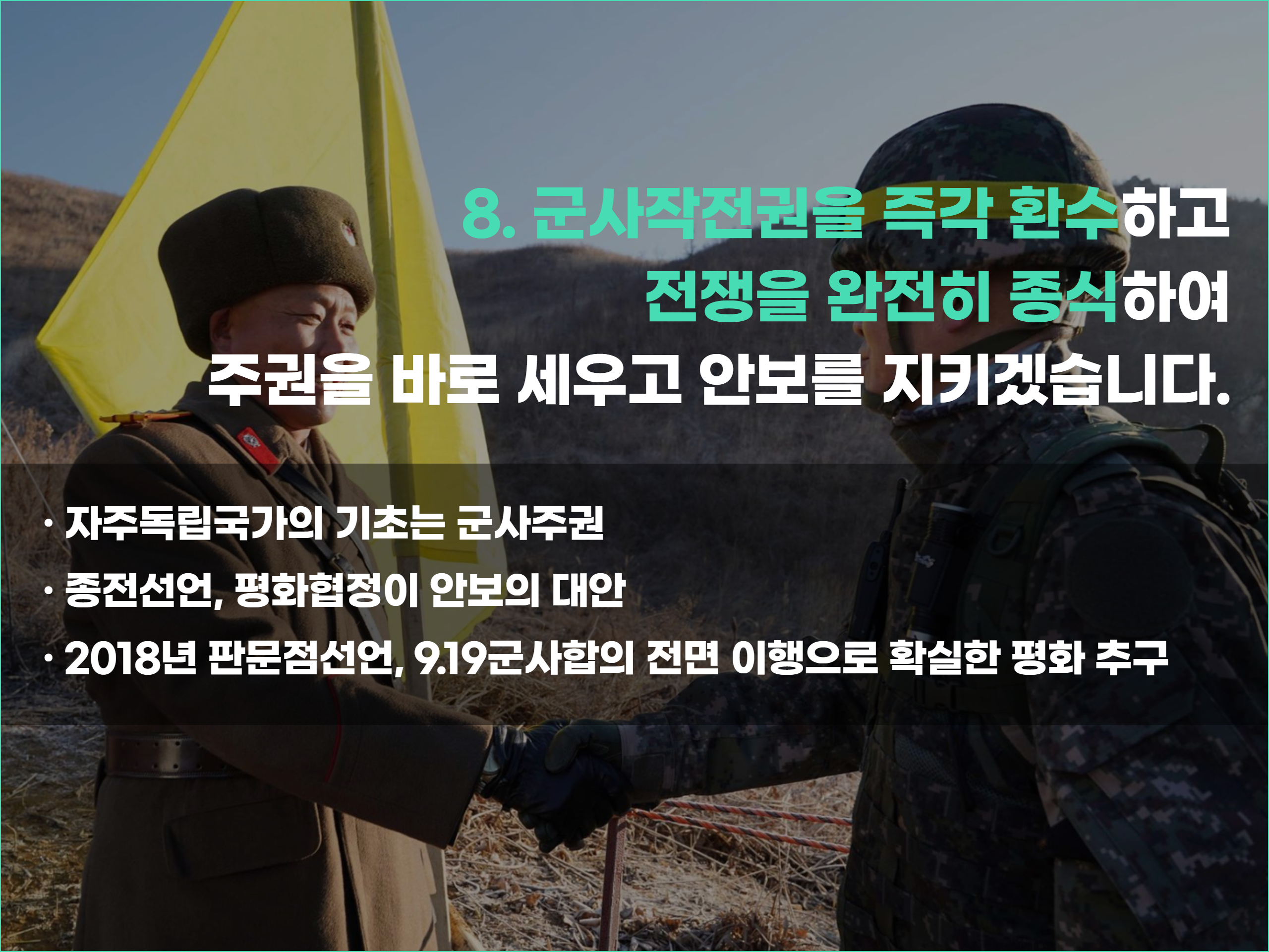8. 군사작전권을 즉각 환수하고 전쟁을 완전히 종식하여 주권을 바로 세우고 안보를 지키겠습니다.