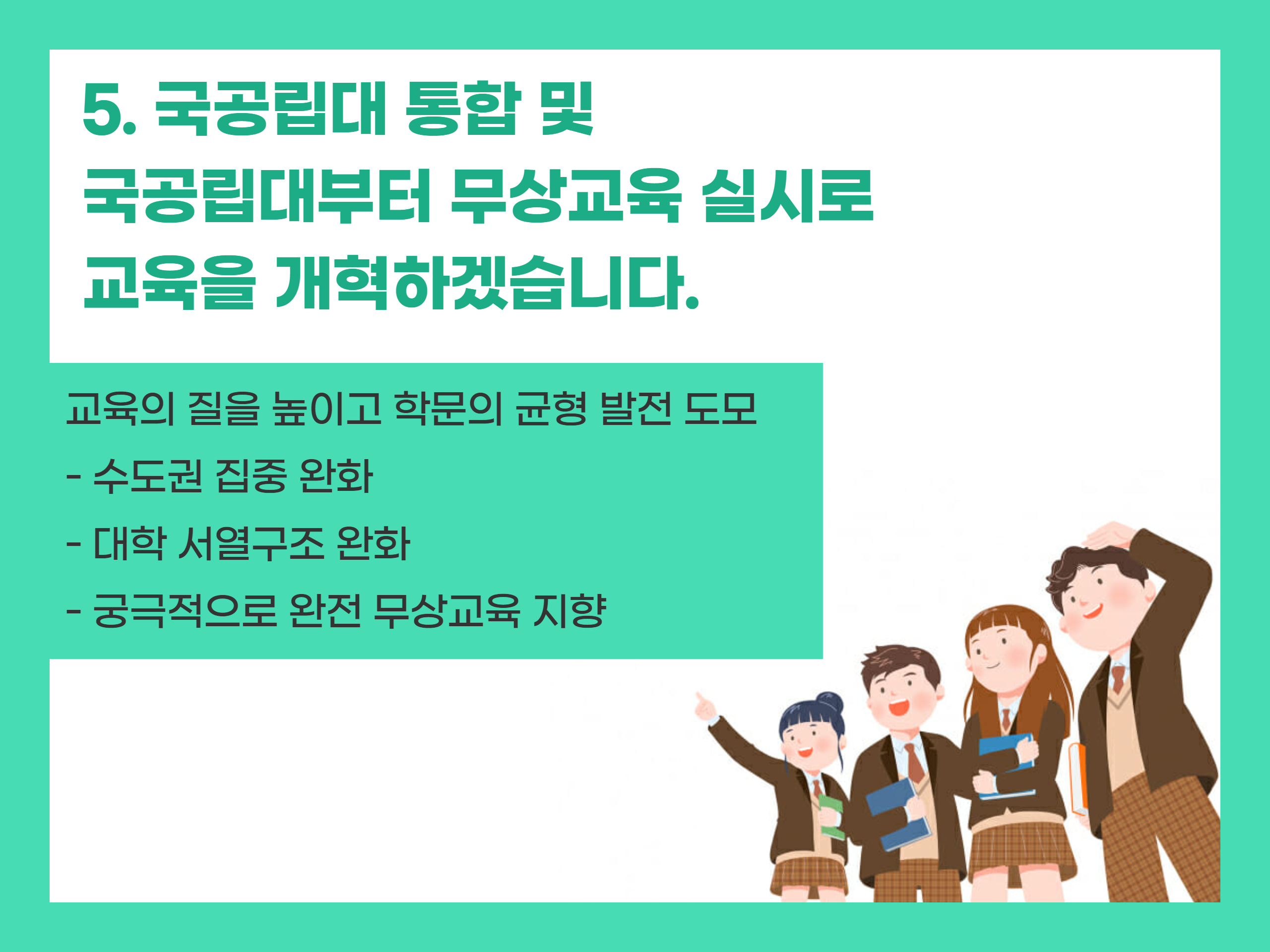 5. 국공립대 통합 및 국공립대부터 무상교육 실시로 교육을 개혁하겠습니다.