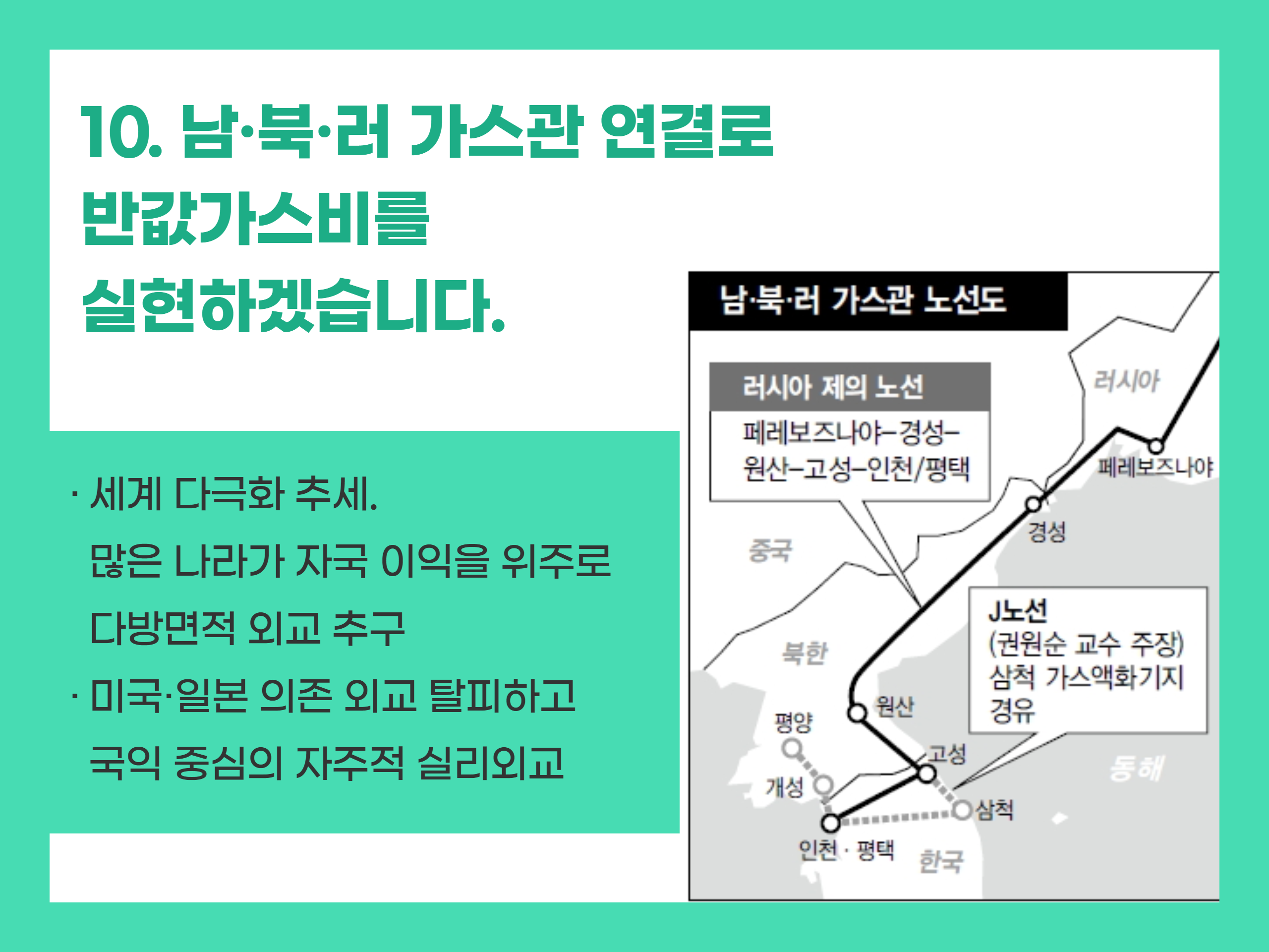 10. 남·북·러 가스관 연결로 반값가스비를 실현하겠습니다.