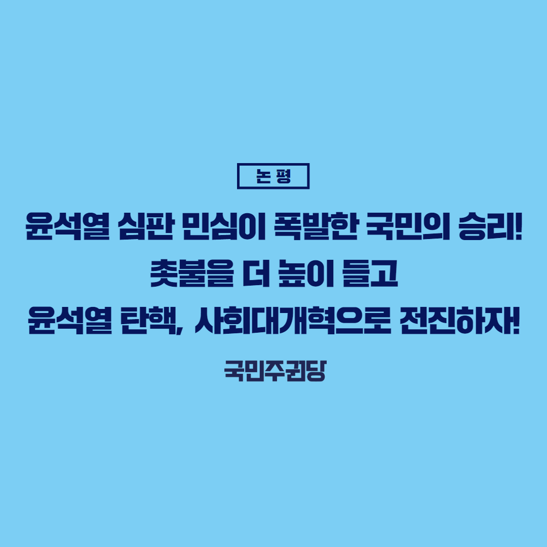 글 제목 : [논평] 윤석열 심판 민심이 폭발한 국민의 승리! 촛불을 더 높이 들고 윤석열 탄핵, 사회대개혁으로 전진하자!