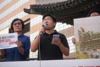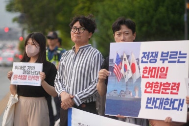 참가자들은 또한 한·미·일 연합훈련 확대·강화 움직임도 규탄하였습니다. 지난 2일 한·미·일 국방장관 회담에서 한·미·일 연합훈련을 다영역으로 확대하고 '프리덤 엣지' 훈련을 개최하기로 한 것을 두고, 이제까지 해상, 공중 훈련을 따로 벌이던 것을 합쳐서 종합적인 전쟁 연습을 벌이려 하는 것이며 그러면 전쟁 위기는 더욱 고조될 수밖에 없다고 반대 목소리를 높였습니다.