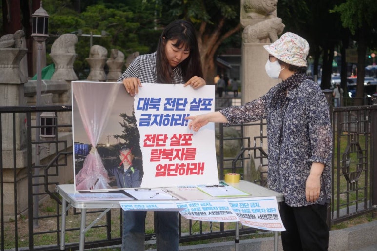 한편 집회장 한켠에서는 '대북 전단 금지 국회 청원 서명'을 받았습니다. 많은 시민분이 관심 갖고 지켜보시고 동참해 주셨습니다. 한 국힘당 지지자 할머님도 대북 전단은 절대로 날리면 안 된다고 윤석열이 왜 그러는지 모르겠다고 욕하고 가셨습니다. 이렇게 온 국민이 전쟁 반대, 전쟁광 윤석열 반대로 한뜻이 되어가고 있습니다.